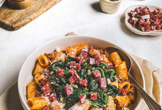 Pâtes au vin rouge et saucisson sec